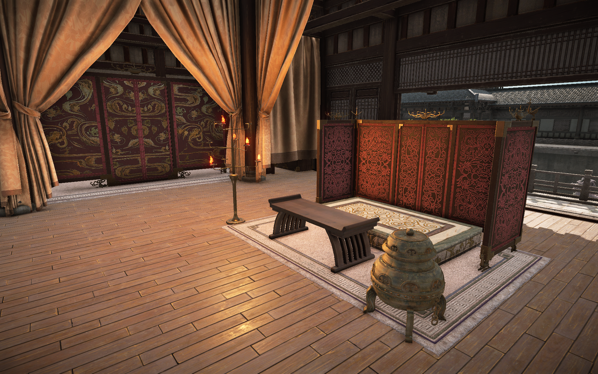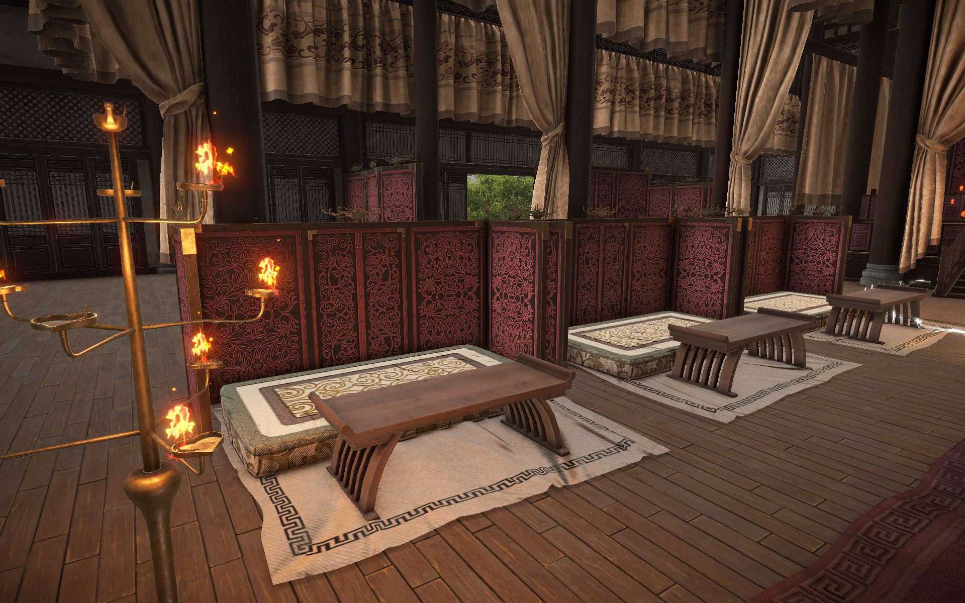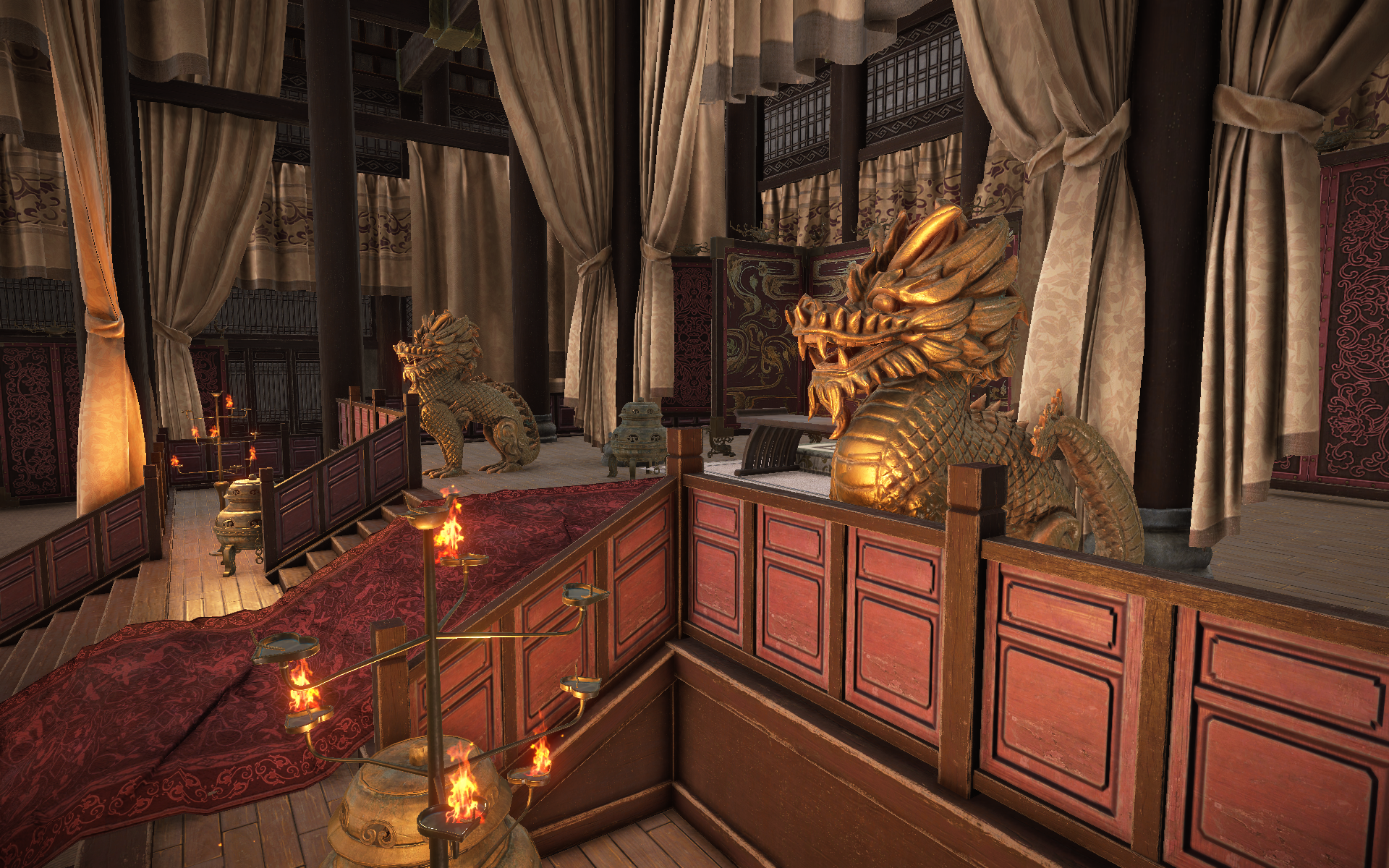 沿着大殿的阶梯一直向前,你就会来到皇帝与大臣处理政务的内殿,同时这里也是游戏内双方阵营争夺的据点。皇帝威坐在前,众将臣台下受命。庄严的帷布交错纵横,金质灯台烛光斑驳,肃穆之感油然而生。