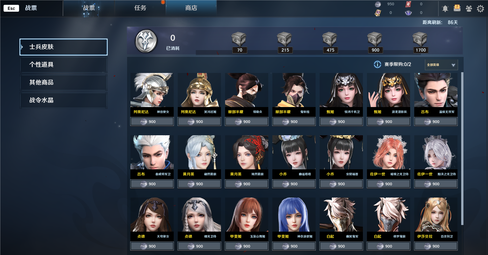 在其他商品和战令水晶界面中,你也可通过战票令牌购买战令武将自选、士兵皮肤兑换券等丰富奖励,以及可以通过战令水晶购买之前所能兑换的累计42款军团皮肤!