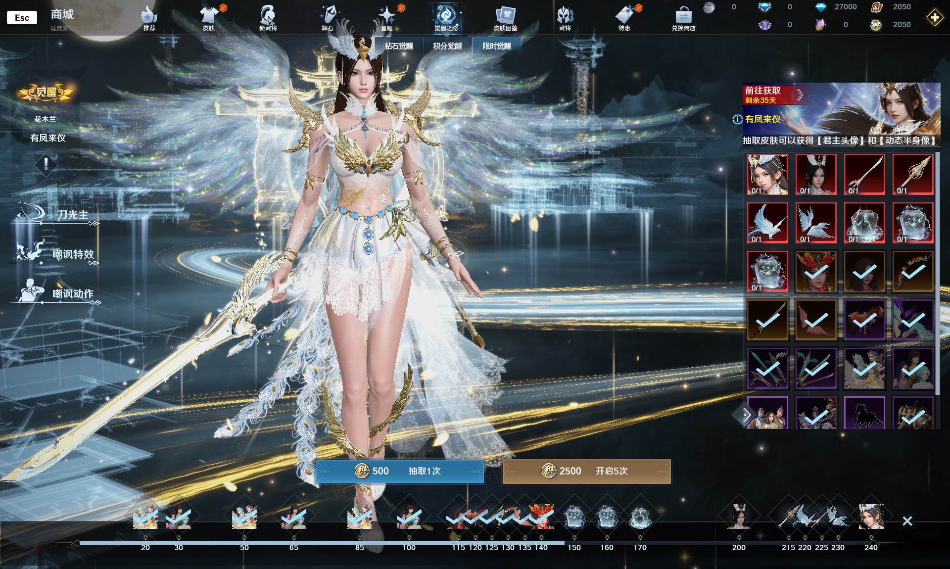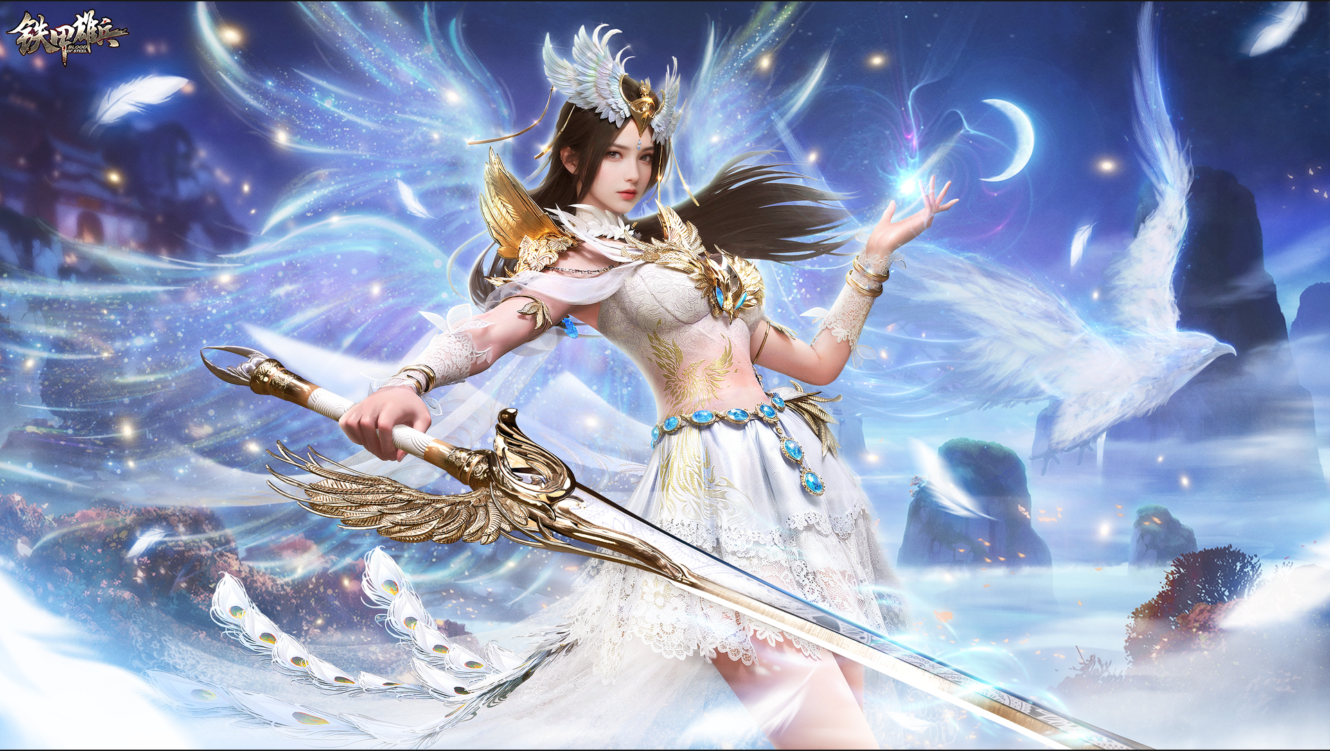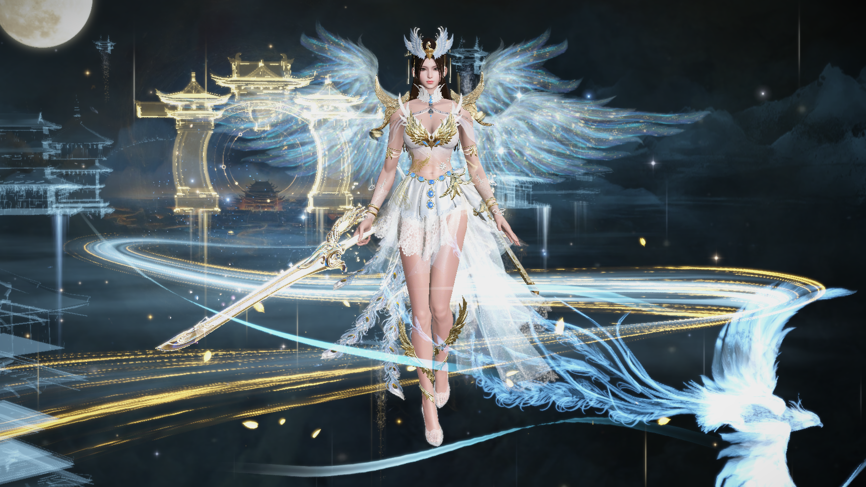 皮肤主题色调呈现为纯洁白色与灿烂金色,仿若白凤振翅,穿云破晓。服饰整体将鸿鹄形象与花木兰身形相结合,既体现了女性柔美的身材曲线,也展示了神鸟的优雅高贵。