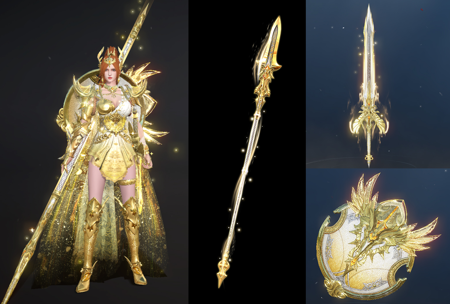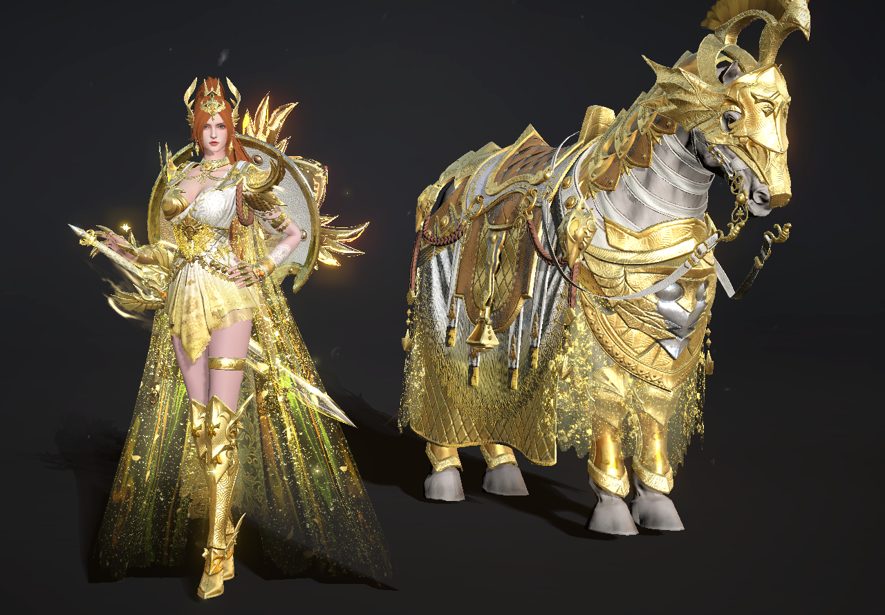 黄金剑盾和黄金枪锋芒闪烁,使敌人望而生畏,头盔呈羽状,增加了神秘感,展示女武神的不俗魅力。当给主副武器升级后,挥舞时的光辉更加闪耀。