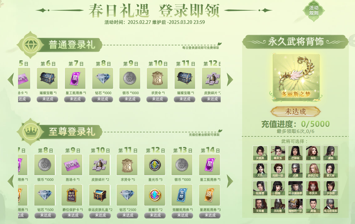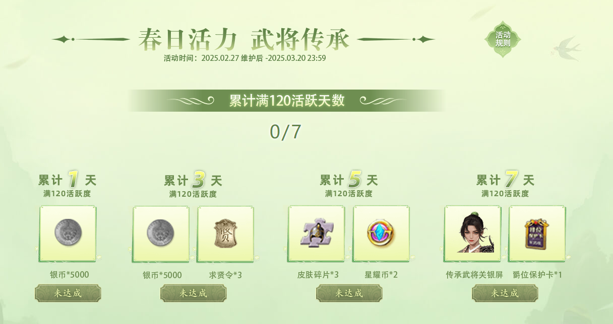 虎女何曾输气概,承传父志美名传。2月27日—3月20日活动期间,各位君主可通过完成每日任务积累活跃度,当满120活跃度分别累计达1/3/5/7天,可获得对应的福利。