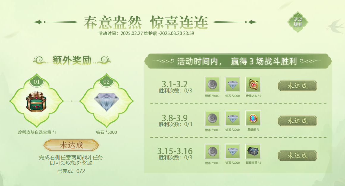 城上春云覆苑墙,江亭晚色静年芳。2月27日—3月20日活动期间,在不同的时间段完成获胜3场战斗的任务,可获得传承之心、璀璨宝箱等奖励。