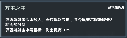 对于怒气值获取,薛西斯及军团射击命中敌人,会获得怒气值。主将射击命中敌人后,还会降低【埃菲尔提斯】的冷却时间。