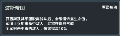 5、中毒增伤:薛西斯武将被动【万王之王】和军团被动【波斯帝国】,都可提高对中毒敌人的伤害。与带有中毒技能的武将共同作战,薛西斯的能力会进一步增强。