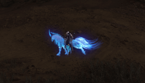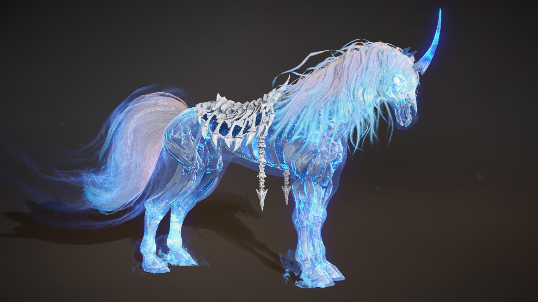 躯干和头部:身上披着刻画着神秘法阵的鞍具,上面法阵若隐若现,散发着神秘而危险的气息。头部生长有突出的骨刺,通透幽蓝,犹如千年寒冰。