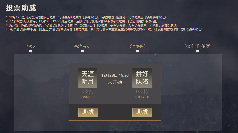 游戏内现已开启赛事助威活动(点击主界面右上赛事按钮,然后点击助威竞猜),完成每日登录游戏、开启120活跃度宝箱等任务,均可获得助威券。
