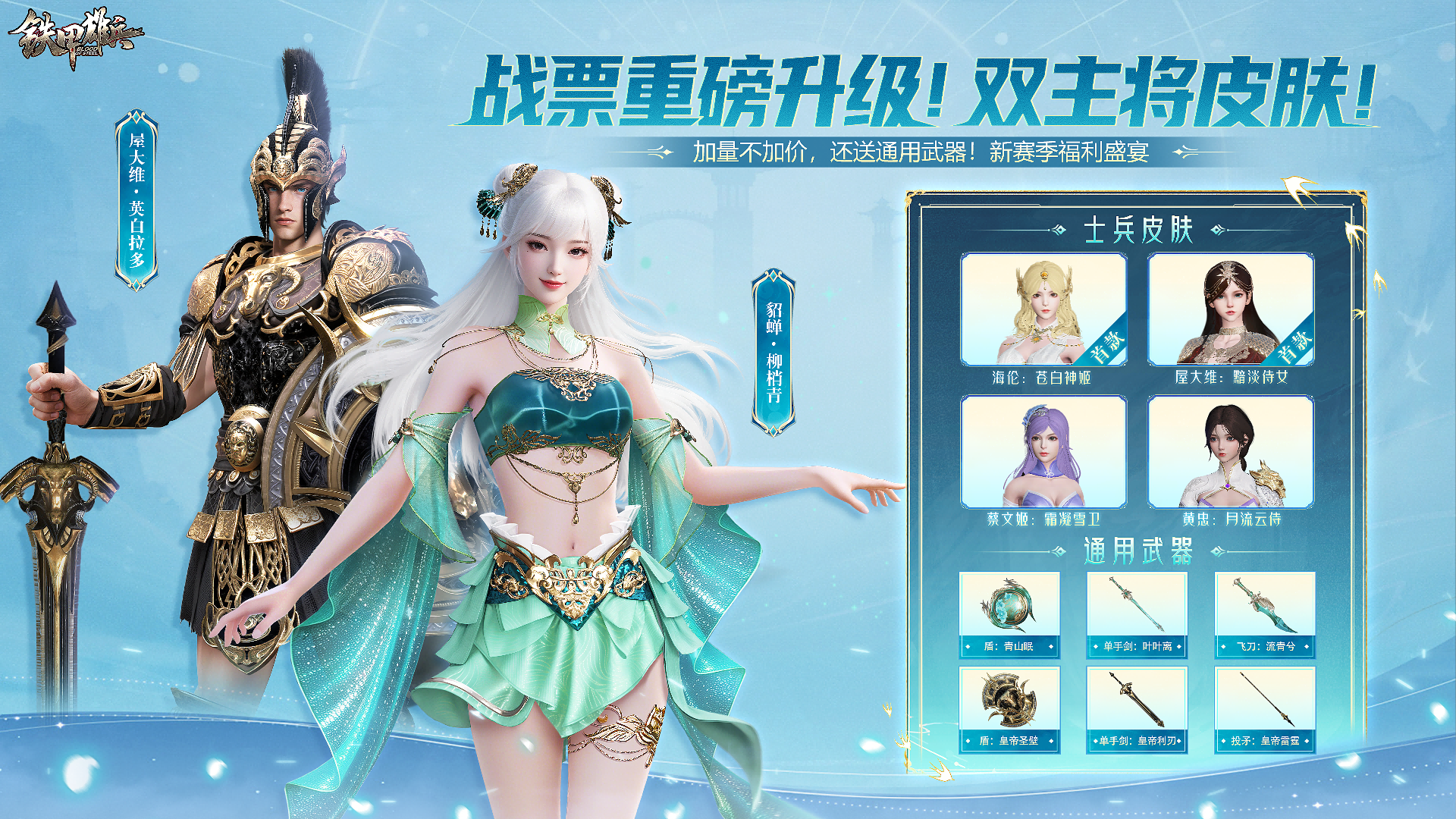 为方便君主们更加自由地为喜爱的武将搭配装备,本次战票特别增加了剑、盾、投矛等6款通用武器奖励!