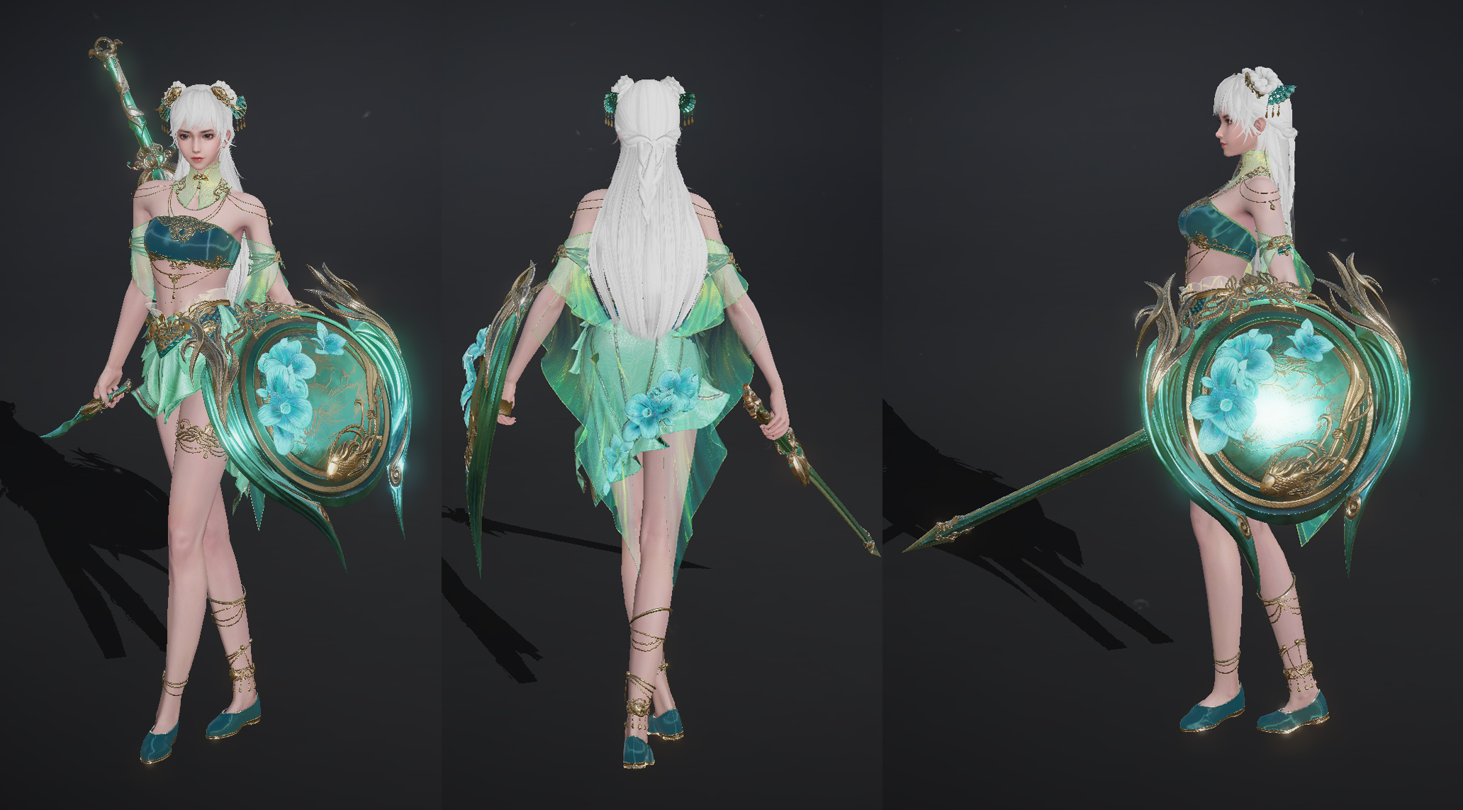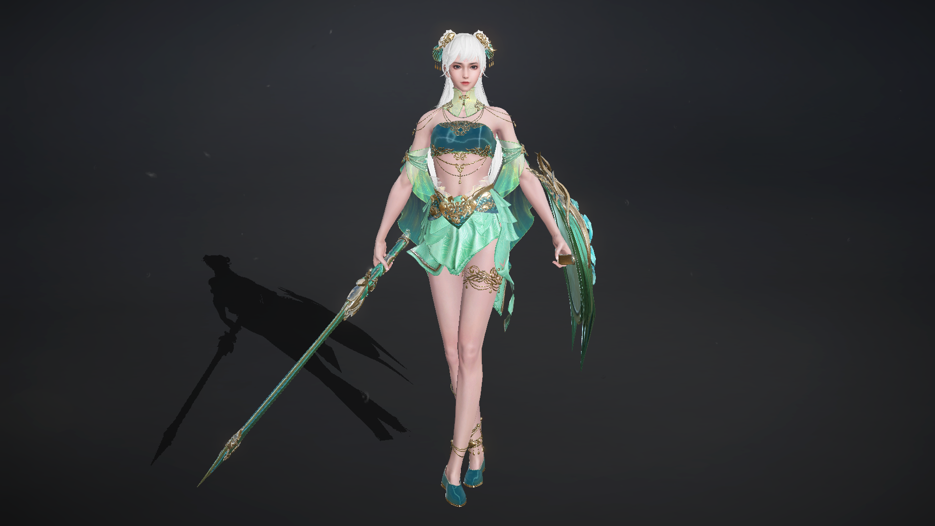 一袭渐变青绿裙装如嫩柳抽芽,抹胸与裙摆的华丽纹饰像晨露缀在枝梢,飘逸的纱袖泛着细碎光泽,恰似风拂柳丝的轻盈;银白长发挽成双环髻,搭配翠色珠饰,既保留了貂蝉的明艳娇美,又添了几分春日精灵般的澄澈气质,每一处线条都透着“柳梢初青”的柔婉灵动。