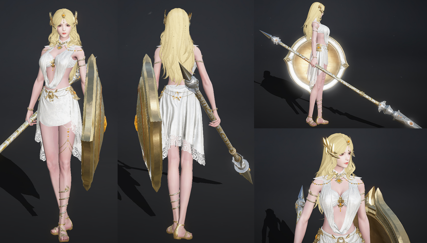 海伦:苍白神姬。柔媚与英武兼具,一袭白纱裙缀满鎏金纹饰,蕾丝裙摆与腿间金链衬出轻盈体态,镶金巨盾透出沙场锋芒,将古希腊战神的英气与女神的华贵优雅融合。
