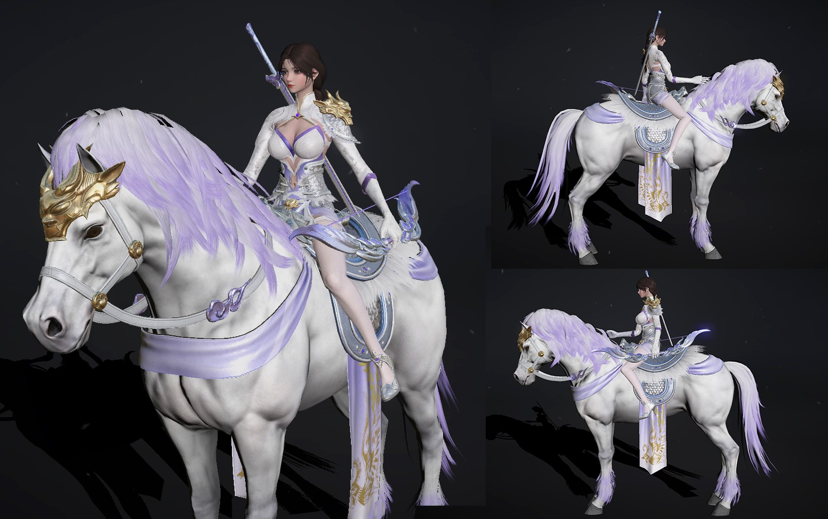 黄忠:月流云侍。将弓兵的灵动与仙韵质感融于一身,白紫主调的甲搭配鎏金饰纹,乘骑的白马覆着紫鬃金饰,手中弓箭利落迅捷。她们既柔美又轻盈,恰似战场上凯旋而来的神箭手。