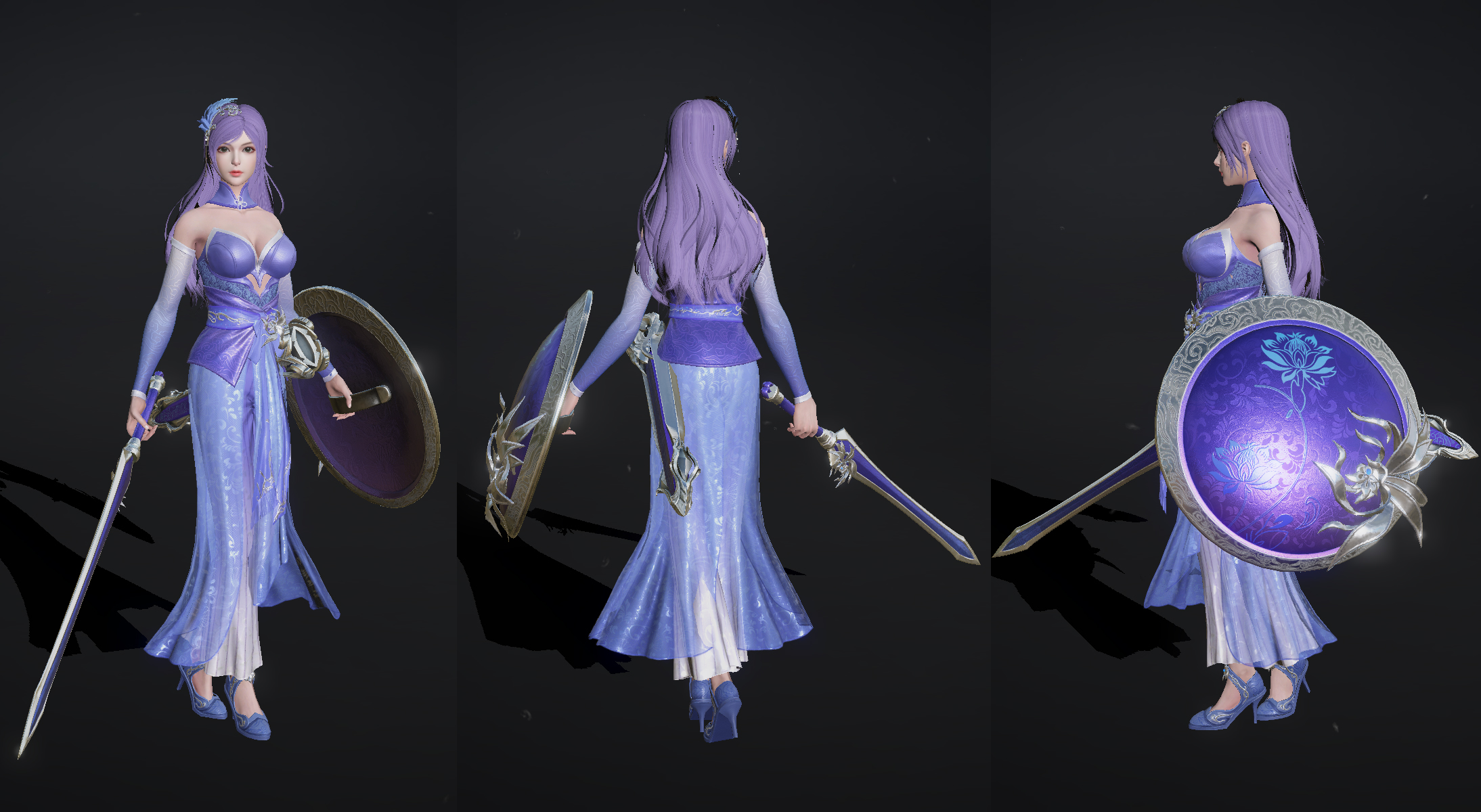 蔡文姬:霜凝雪卫。浑身高洁清丽,淡紫长裙优雅温婉,紫色长发秀丽动人。她们手持轻巧长剑与缀花圆盾,又透出飒爽的凛冽锋芒,仿佛是从书卷里走出的战场守护者。