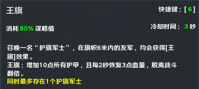 [王旗]技能调整,消耗谋略值召唤出一名护旗军士。旗帜效果范围内的友军,均会获得[王旗]效果,提高护甲,每秒恢复血量(脱战效果翻倍)。