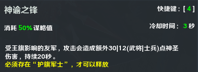 消耗谋略值释放。释放后,受王旗影响的单位,攻击会造成额外神圣伤害,持续一定时间。此技能可提高已方军团的进攻能力,若配合戈弗雷等输出型武将队友,可实现1+1>2的效果。