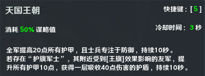消耗谋略值释放,全军提高所有护甲,且士兵专注于防御,持续一定时间。