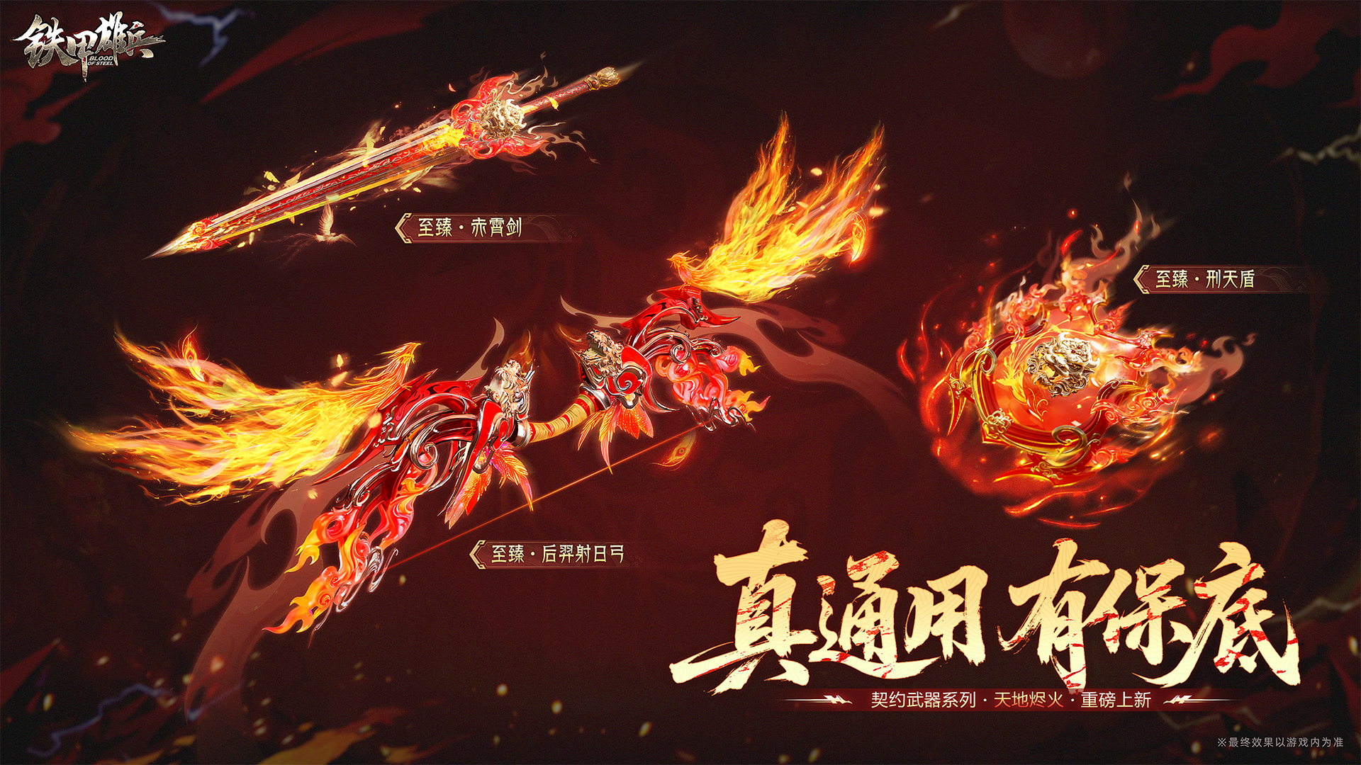 时至今日,神兵恢复灵性,全新契约武器系列“天地烬火”现世!该系列包含六把神兵,本次爆料至臻·后羿射日弓、至臻·赤霄剑(双手剑)、至臻·刑天盾,及系列配饰(头像、底座等)。