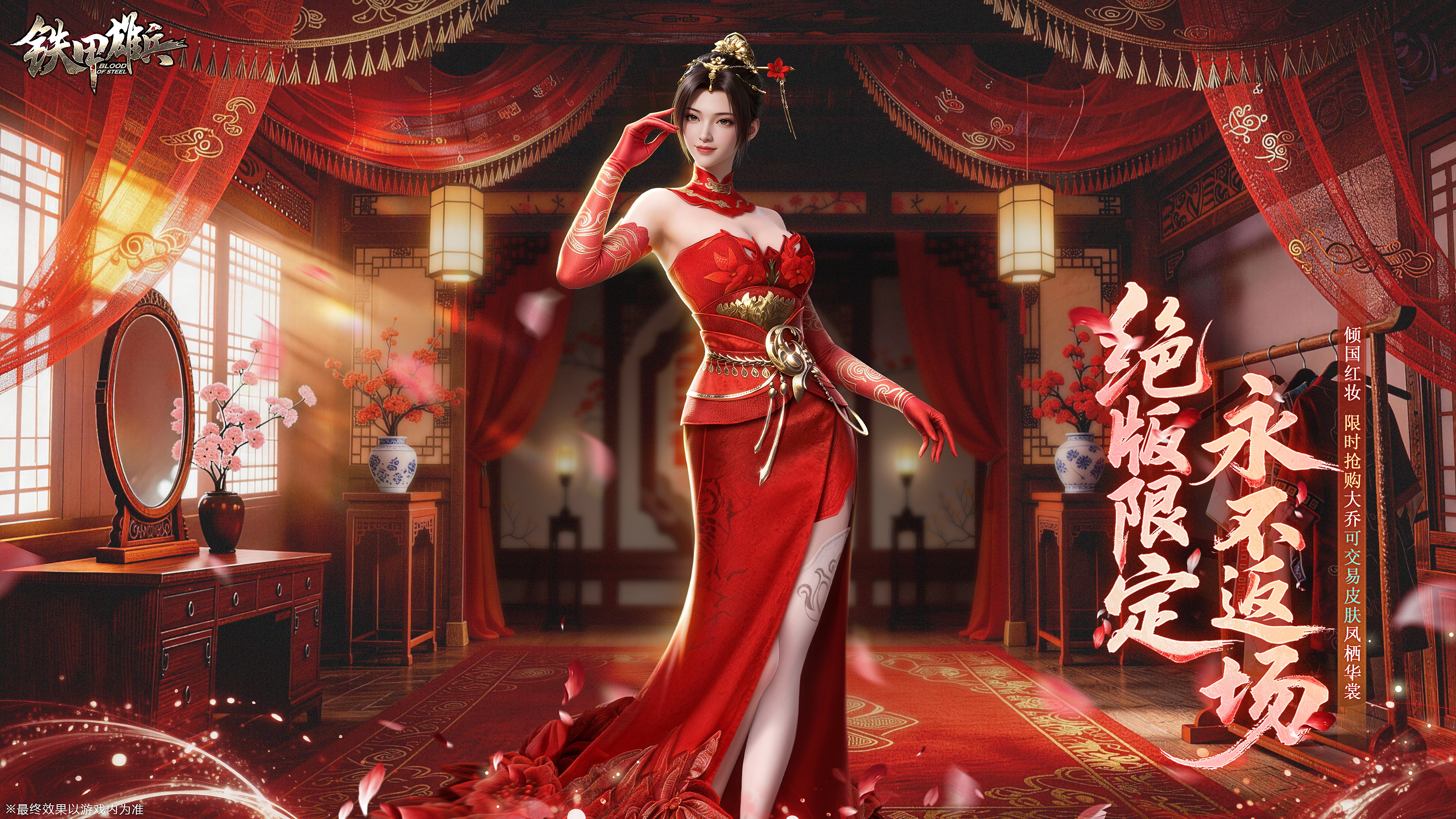 大乔轻提裙摆,红绸如火焰般流转。当她步出闺房,满堂宾客皆为惊艳。那抹红,既有女儿家的柔媚,又有铁甲般的铿锵锋芒。