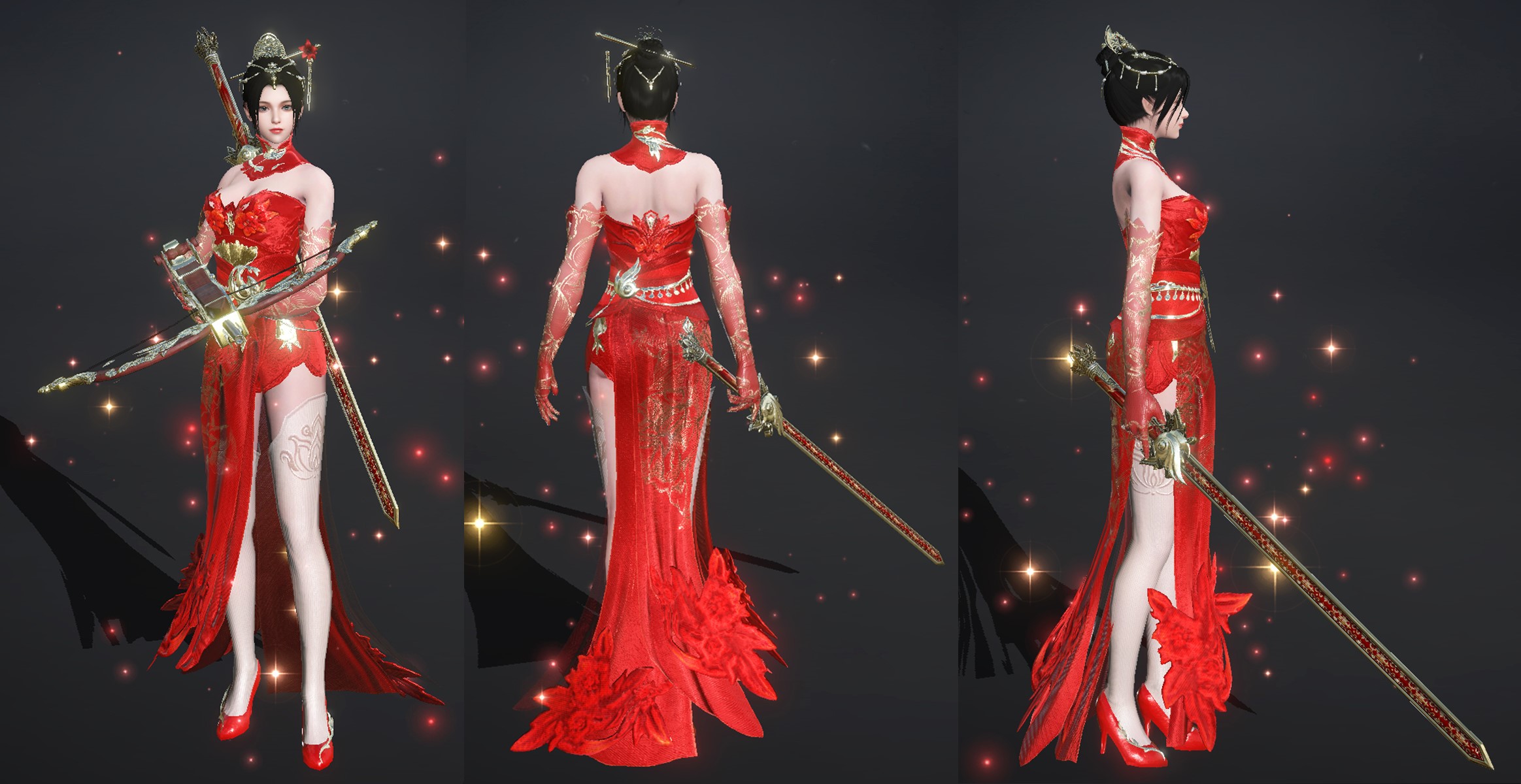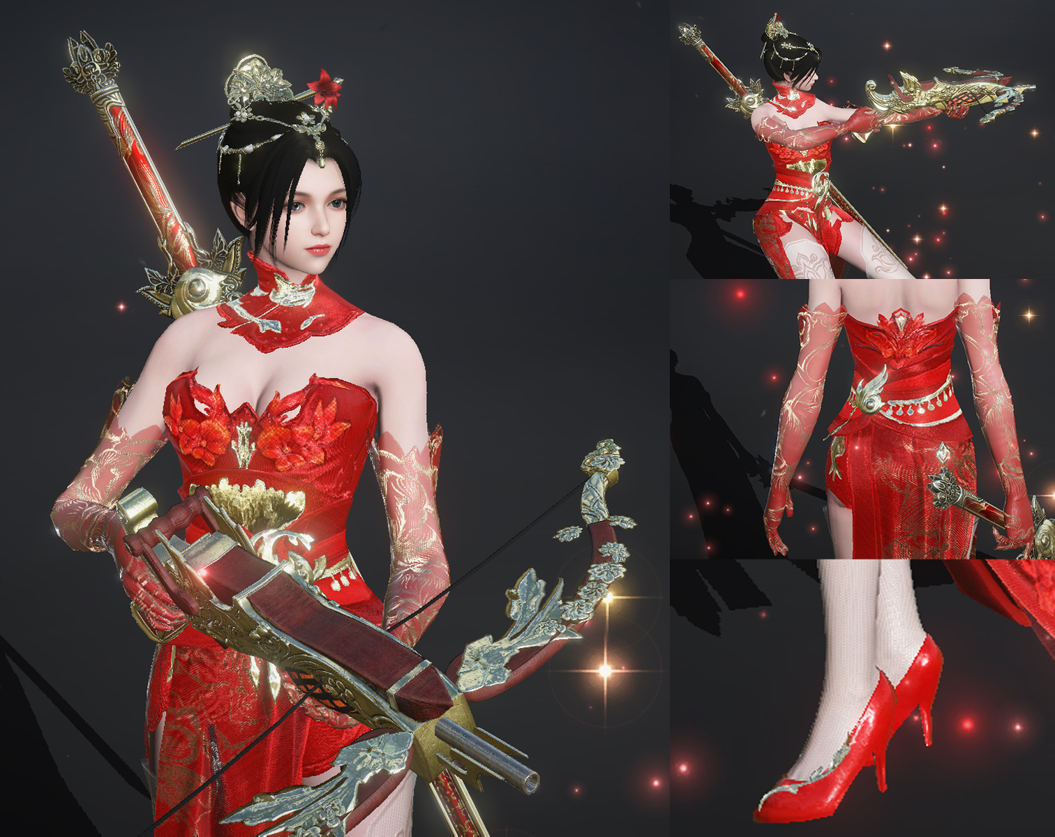 主色采用中式婚嫁的正红,剪裁上则摒弃了传统婚服的宽袍大袖,采用修身剪裁与高开衩设计,配以白色丝袜、红色高跟鞋勾勒出流畅的身体线条,行动更显轻盈灵动。