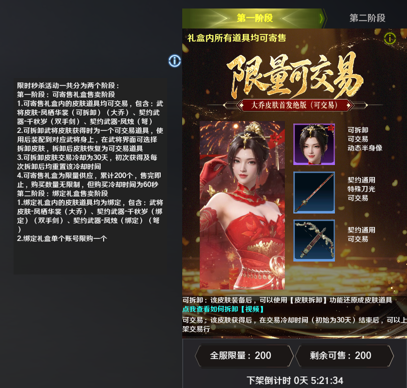 非绑定款皮肤售卖时间:3月12日15点~3月12日24点,持续9小时。全服限量200套,若提前卖完,则显示“已售罄”,无法购买。具体规则可见下图。