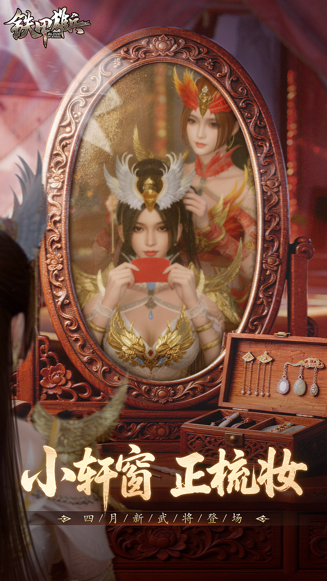 【新武将爆料】小轩窗,正梳妆 2026-03-24 14:29 良辰美景,二佳人梳妆照镜, 凤冠霞服,焕光流彩于轩阁。 镜于颜,可观美丑; 镜于心,则辨忠奸。 4月新武将登场!后续小宝还会爆料更多线索,诸位君主猜猜看他是谁呢?