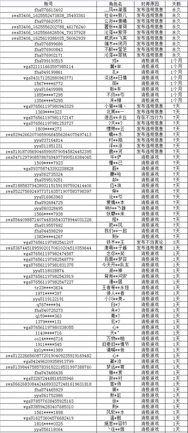 以下为本次公布的封停名单: