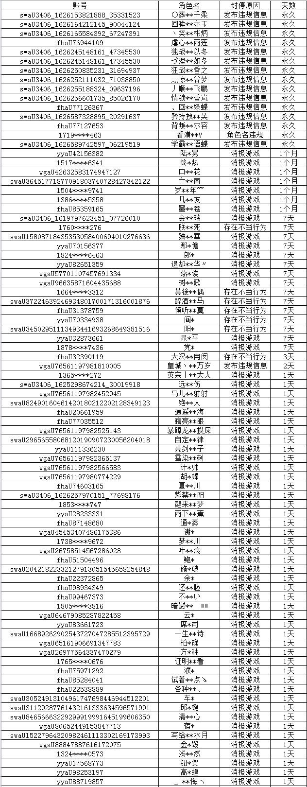 以下为本次公布的封停名单: