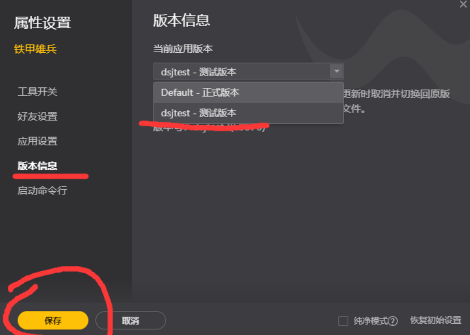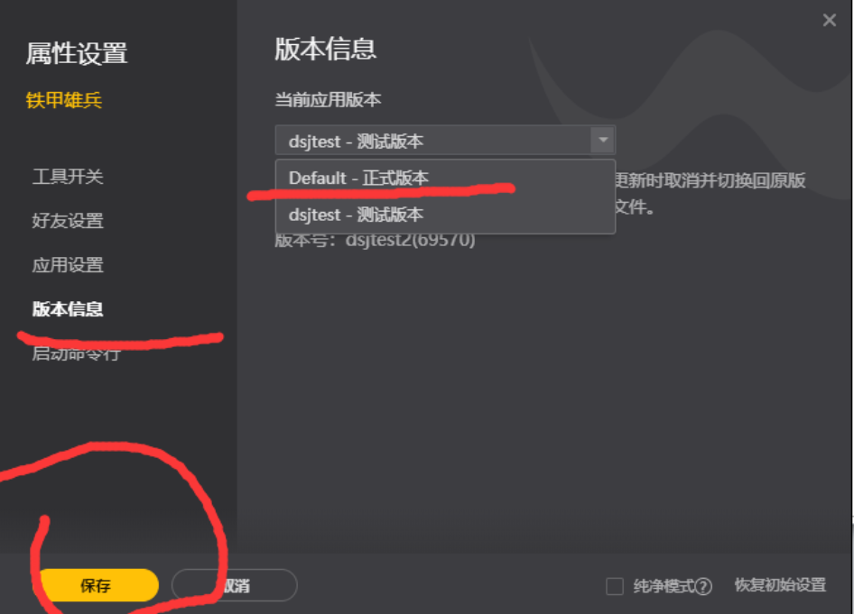 (如果需要进入铁甲雄兵和兵临城下服务器,按照以上操作将版本切换成Default—正式版本,点击保存后更新即可)