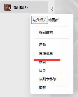 1)右键点击左侧铁甲雄兵图标,点击“属性设置”
