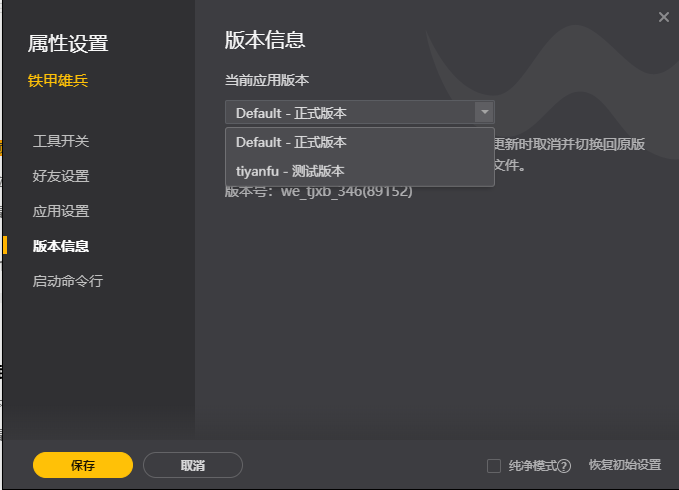 2)点击“版本信息”,选择“tiyanfu—测试版本”,点击保存后启动游戏即可