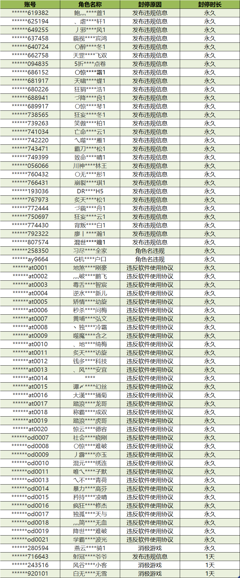 以下为本次公布的封停名单: