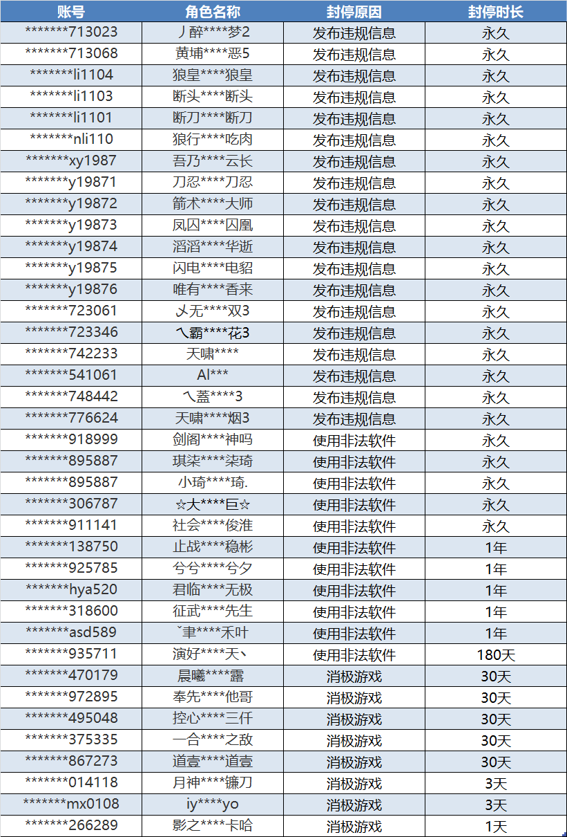 为保证游戏的公平与公正,运营团队会在及时对辅助、外挂打击之外,针对游戏过程中存在消极游戏、恶意参于爵位赛的角色也将进行惩罚,惩罚名单会定期在社区发布近期封停名单公告。