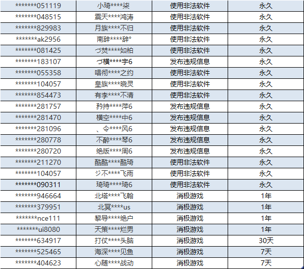 为保证游戏的公平与公正,运营团队会在及时对辅助、外挂打击之外,针对游戏过程中存在消极游戏、恶意参于爵位赛的角色也将进行惩罚,惩罚名单会定期在社区发布近期封停名单公告。