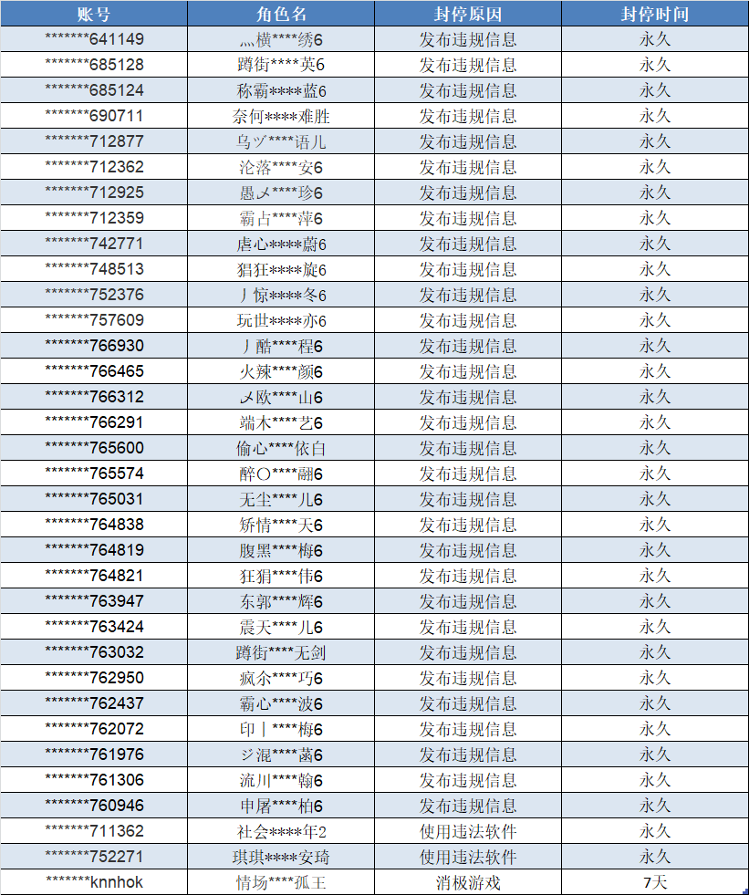 为保证游戏的公平与公正,运营团队会在及时对辅助、外挂打击之外,针对游戏过程中存在消极游戏、恶意参于爵位赛的角色也将进行惩罚,惩罚名单会定期在社区发布近期封停名单公告。