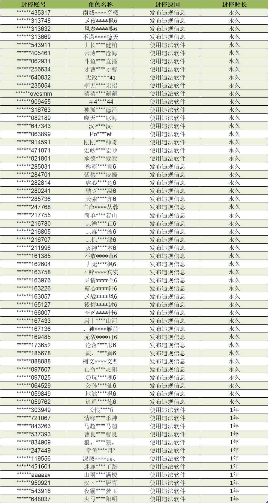 以下为本次公布的封停名单: