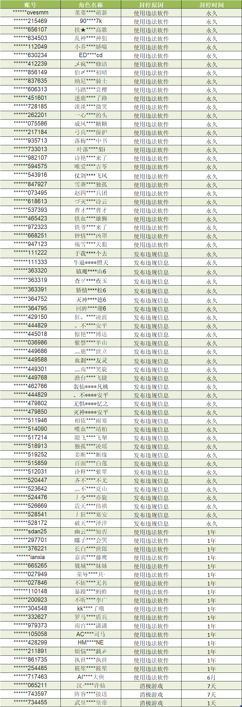 为保证游戏的公平与公正,运营团队会在及时对辅助、外挂打击之外,针对游戏过程中存在消极游戏、恶意参于爵位赛的角色也将进行惩罚,惩罚名单会定期在社区发布近期封停名单公告。