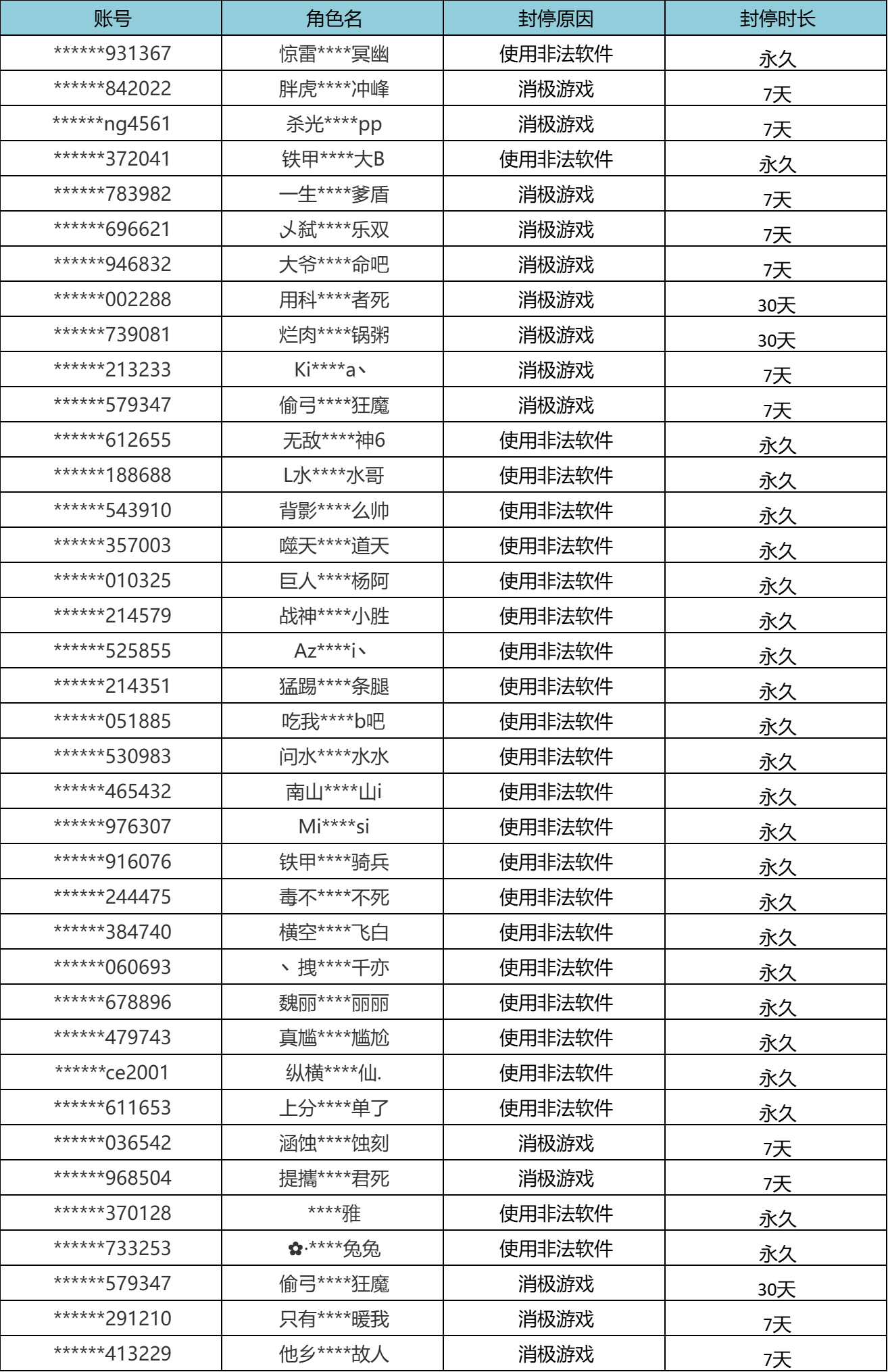 为保证游戏的公平与公正,运营团队会在及时对辅助、外挂打击之外,针对游戏过程中存在消极游戏、恶意参于爵位赛的角色也将进行惩罚,惩罚名单会定期在社区发布近期封停名单公告。